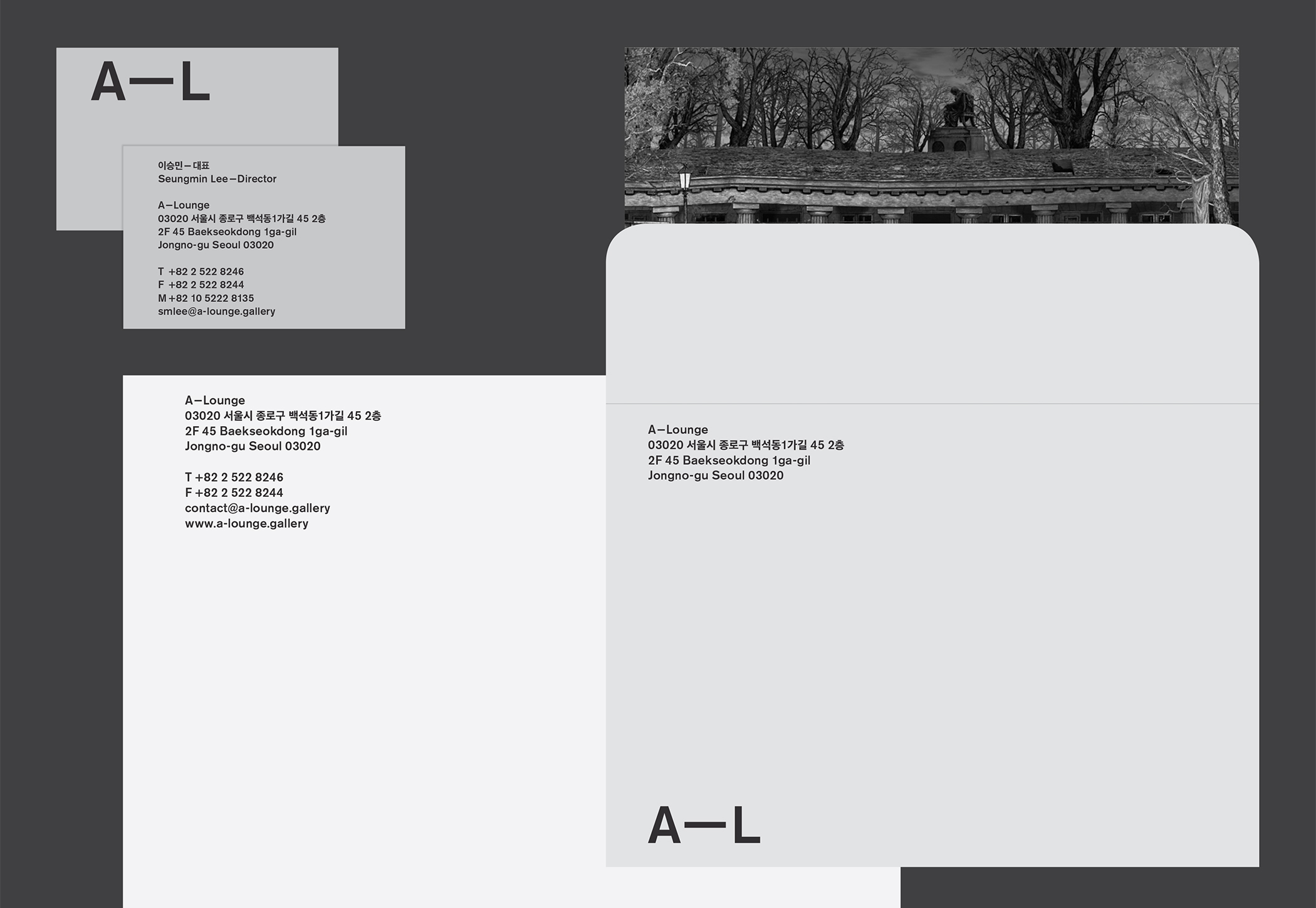 Identity and business stationery design for A—L, a private art gallery located in Seongbuk-dong, Seoul. The gallery focuses on contemporary Korean artists and establishes diverse channels to introduce them to the international art scene.